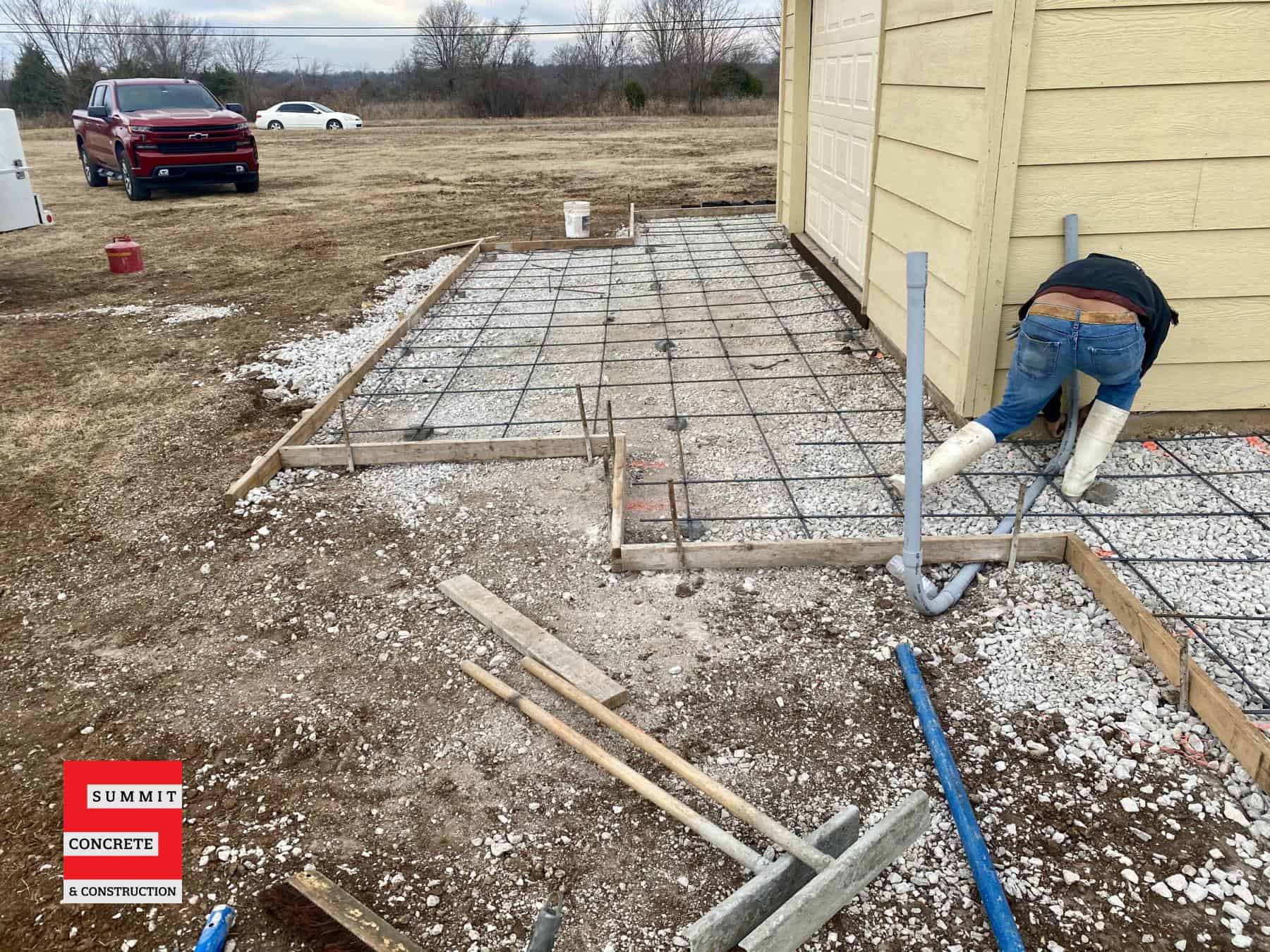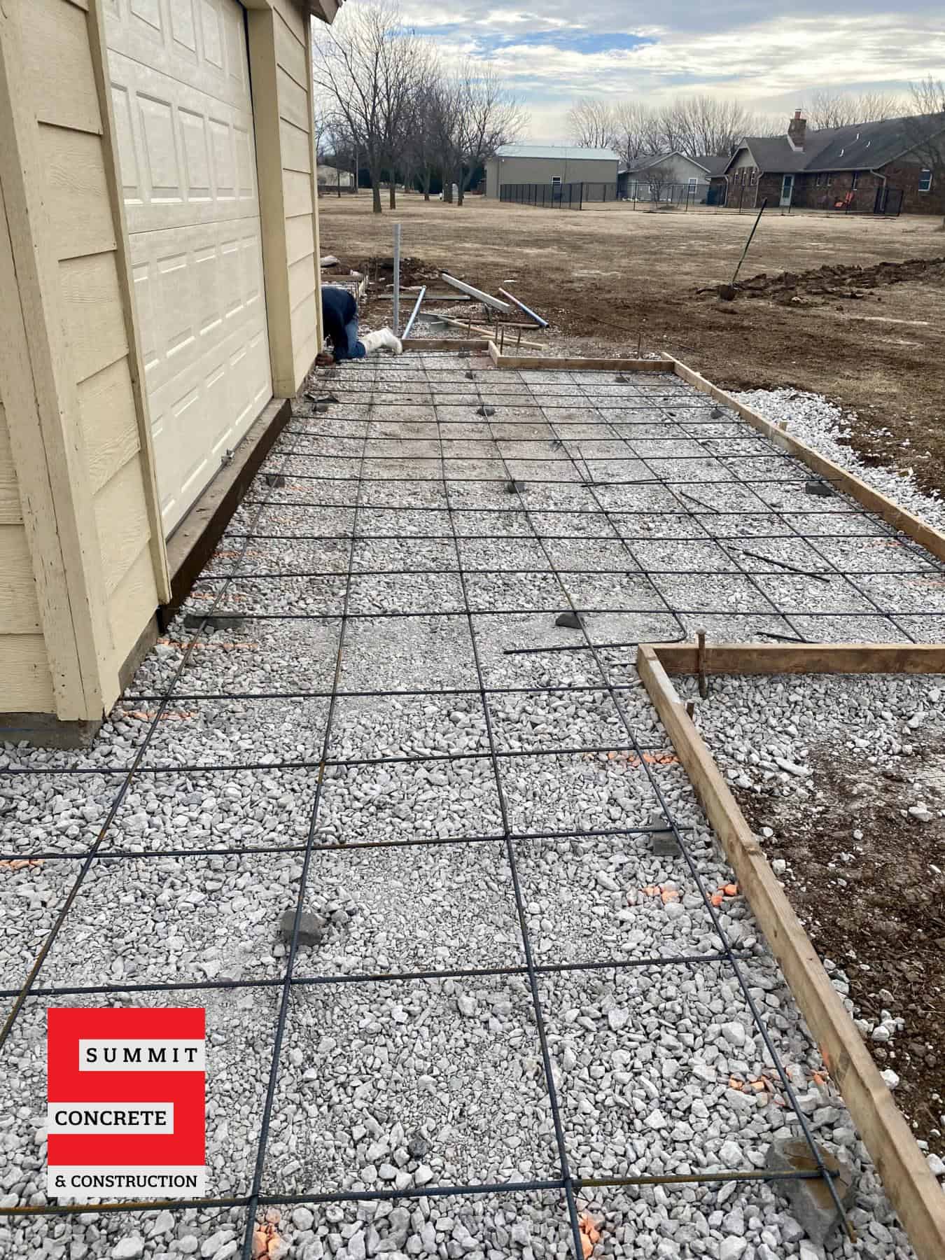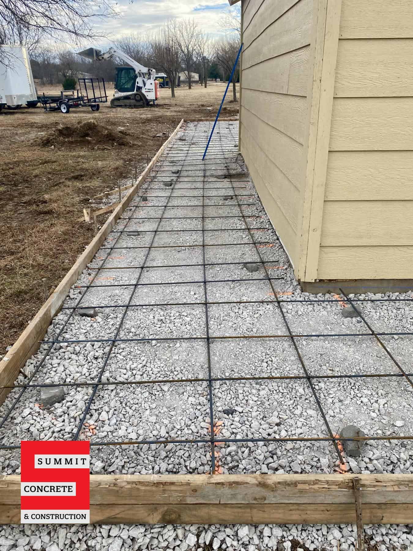 This flatwork project adds a shop building slab, will accommodate a trailer, and a small shop.